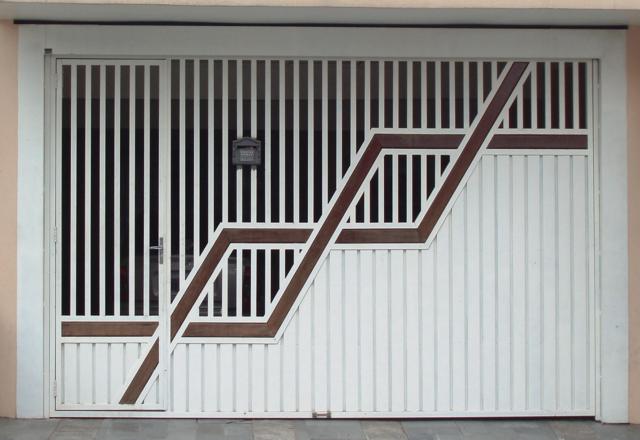 Materiais: Portão de Garagem fabricado com Tubo 40 x 20mm espaço 70mm, Lambril de Chapa 0,65mm e Madeira.